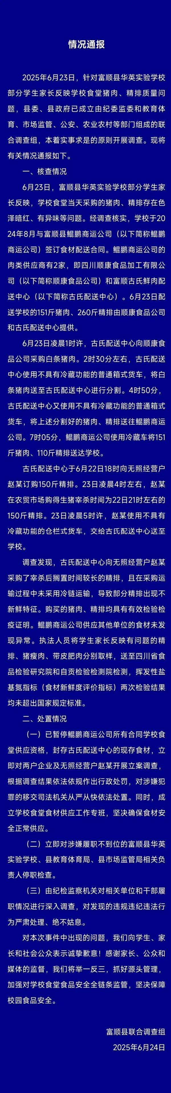 6月23日,齐鲁晚报·齐鲁壹点报道了自贡市富顺县华英实验学校给学生吃发臭的排骨。报道发出后,引起广泛关注。6月24日,自贡市富顺县联合调查组发布情况通报,对富顺县华英实验学校食材问题调查情况进行通报。