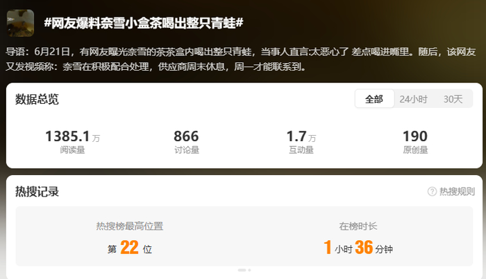 “奈雪的茶小盒茶喝出青蛙”上热搜 市监部门称门店已赔