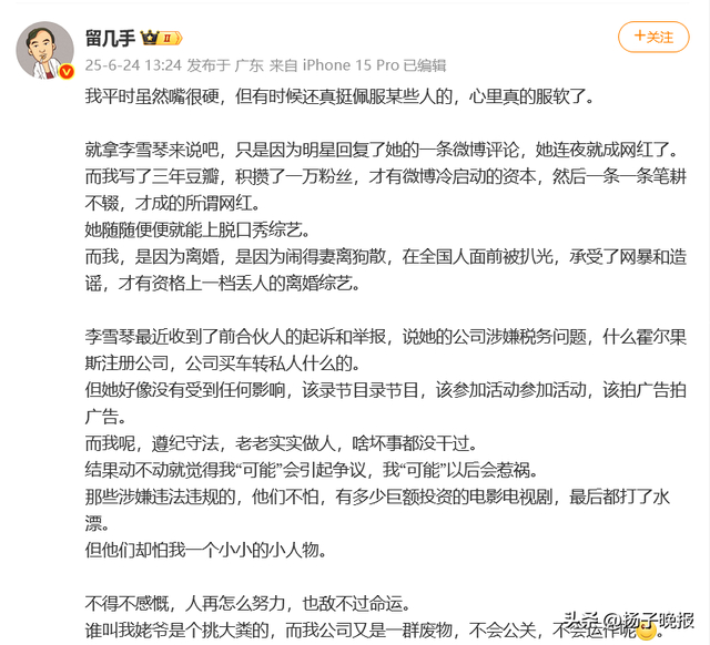 微博粉丝超1300万的知名大V留几手发长文谈论李雪琴的成名之路和纠纷风波,称“只是因为明星回复了她的一条微博评论,她连夜就成网红了,随随便便就能上脱口秀综艺”。