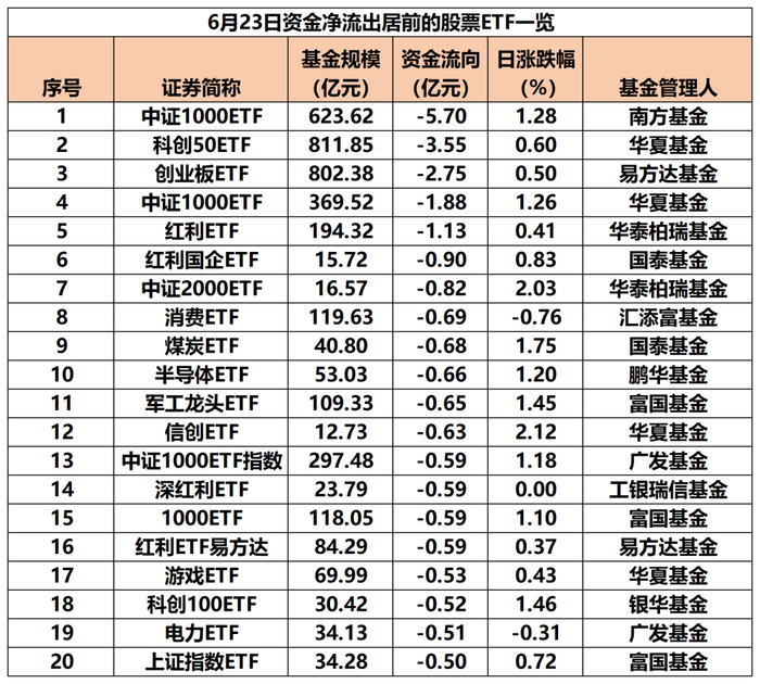 6月23日,三大指数低开高走,数字货币、跨境支付等概念轮番演绎。股票ETF(含跨境ETF)整体资金净流入超50亿元,其中,中证A500指数、沪深300指数、上证50指数等相关宽基ETF产品成为“吸金”主力,消费、煤炭、半导体、军工、信创等热门主题ETF产品资金净流出居前。