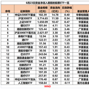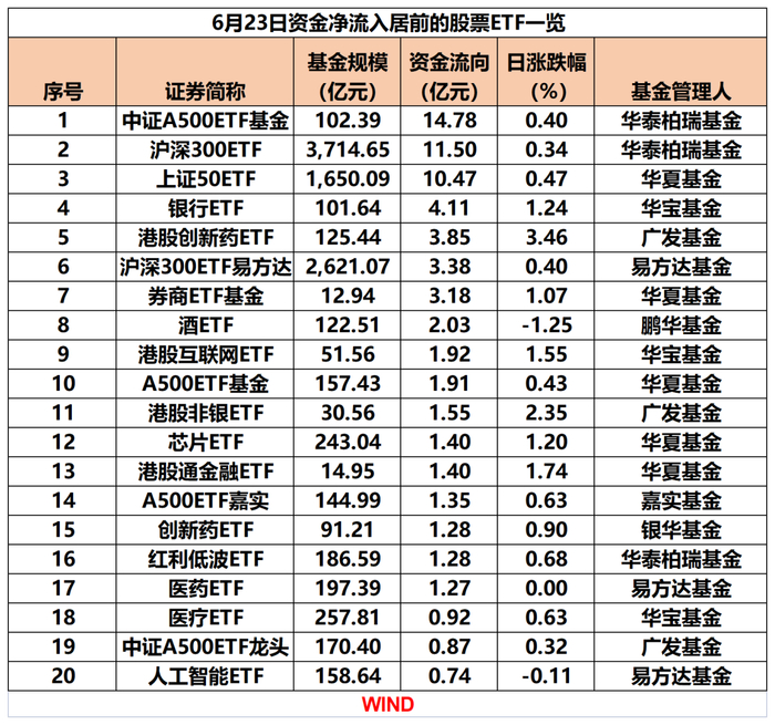 具体到指数和板块维度,6月23日,流入前5板块为中证A500指数(净流入20.5亿元)、沪深300指数(净流入16.0亿元)、上证50指数(净流入11.1亿元)、银行板块(净流入5.6亿元)、医药板块(净流入5.0亿元)。