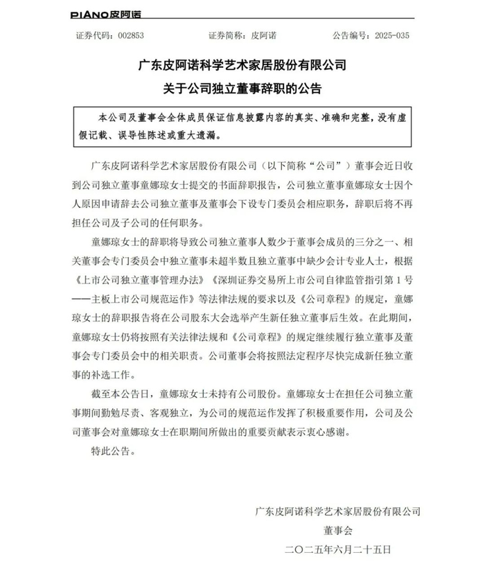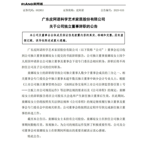 6月24日,皮阿诺发布公告称,公司董事会近日收到独立董事童娜琼女士的书面辞职报告,童娜琼女士因个人原因申请辞去公司独立董事及董事会下设专门委员会相应职务,辞职报告将在公司股东大会选举产生新任独立董事后生效,在此期间仍将履职,公司将尽快完成补选工作。