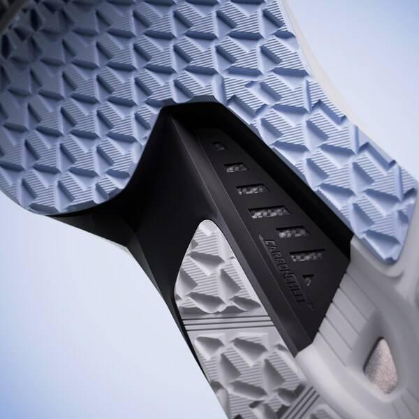 为了进一步提升跑步过程中的推进力,鞋款中底采用轻量化的超临界发泡材料,兼具出色回弹性与柔韧脚感,使跑者在每一步中都能感受到轻盈而灵敏的跑感。中底整体加宽设计,在保持灵活性的同时提供更稳固的落地支撑。与此同时,鞋中足嵌入TPU与碳芯复合结构,为足部提供稳健支撑力,尤其适合追求节奏稳定与保护性能的入门级跑者。此外,鞋底采用箭头纹理橡胶大底设计,强化地面摩擦力,无论是城市铺装道路还是轻度户外地形,均能实现灵活抓地。