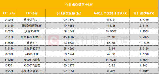 从成交额前十的ETF来看,香港证券ETF(513090)成交额位居首位,港股创新药ETF(513120)成交额位居次席。