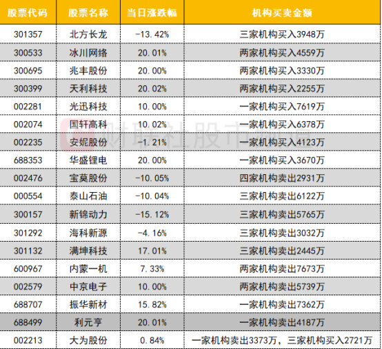 卖出方面,多只油气股遭机构卖出,其中泰山石油遭机构卖出超6000万;军工股内蒙一机遭机构卖出超7000万;固态电池概念股振华新材遭机构卖出超7000万。