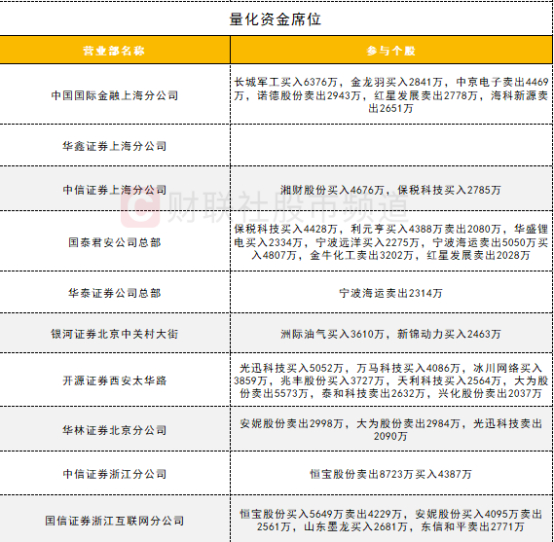 量化资金活跃度较高,长城军工获一家量化席位买入超6000万;恒宝股份遭两家量化席位做T。