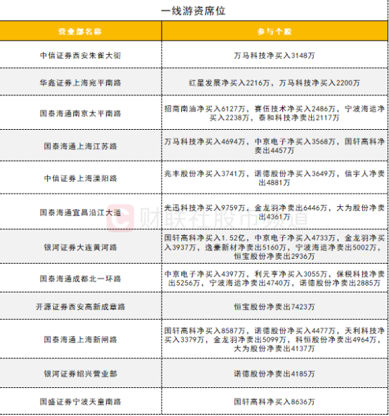一线游资活跃度有所回升,国轩高科获三家一线游资席位合计买入超3.2亿;PCB概念股中京电子和智能驾驶概念股万马科技均获三家一线游资席位买入。