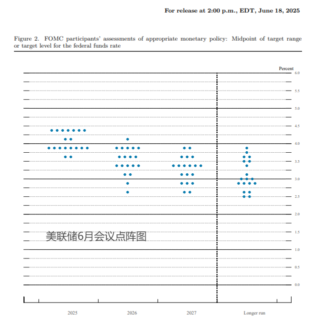 上周,美联储将利率维持在4.25%-4.50%的区间不变。然而6月的点阵图显示,尽管多数官员(8位)预计到2025年底将有两次降息,但仍然有多达七人支持年内“不降息”,与支持降息2次的官员人数接近,体现出委员会内部的意见分歧。