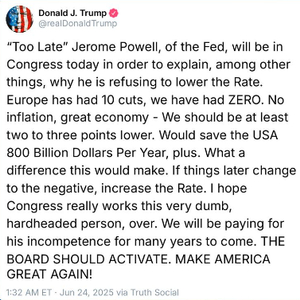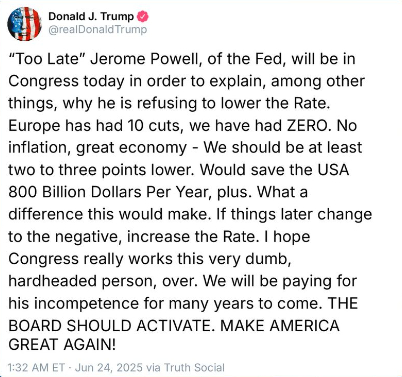然而就在这场重要听证会之前的几个小时里,美国总统特朗普再一次在社交平台上抨击鲍威尔,认为美联储利率至少应该下调2到3个百分点,并且呼吁国会教训一下鲍威尔这个“死脑筋”。