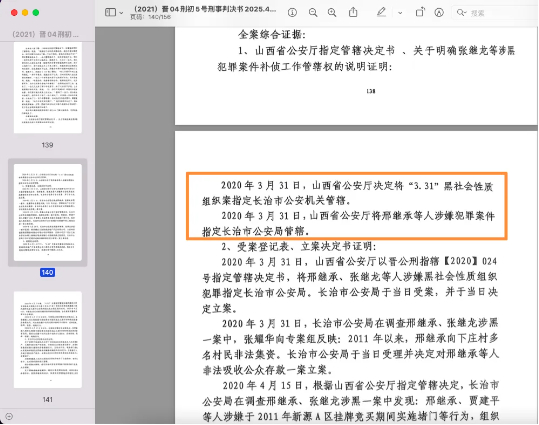 媒体注意到,山西长治中院的判决记录,2020年3月31日,山西省公安厅将“3.31”黑社会性质组织案指定给长治市公安机关管辖。长治市公安局确实有“当日受理、当日立案”。张耀华当天向专案组反映情况……