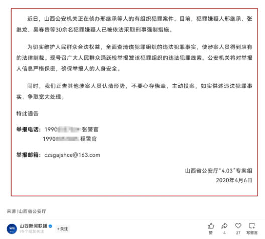 同月6日,山西省公安厅发布了《关于检举揭发邢继承等人犯罪组织违法犯罪行为的通告》,号召广大群众踊跃检举揭发。