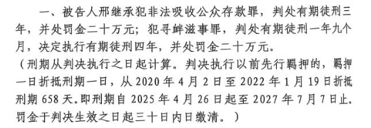 值得注意的是,邢继承2020年3月31日被采取强制措施。2022年1月19日,长治中院变更强制措施为取保候审,案件久拖不决,直到2025年4月30日,长治中院才对邢继承等人案件作出一审判决,认定邢继承犯非法吸收公众存款罪和寻衅滋事罪,两罪并罚,判处其有期徒刑四年。