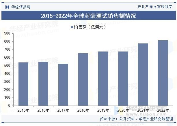 随着整个半导体产业的技术进步、市场发展、人力成本、政府政策扶持等因素的作用,全球集成电路封测产业聚集中心已从起源地美、欧、日等地区逐渐分散到中国台湾、中国大陆、新加坡和马来西亚等亚太地区。根据中国半导体行业协会信息显示,受到2022年下半年消费电子疲软的冲击,2022年全球封测营收增速放缓,全球封装测试市场营收规模为815亿美元,同比增长4.9%。