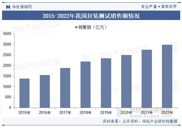 我国集成电路封装测试是整个半导体产业中发展较为成熟,在规模和技术能力方面与世界先进水平较为接近。近年来,我国集成电路封装测试业销售额逐年增长,从2015年的1384亿元增至2022年的2995.10亿元,年复合增长率11.79%。受宏观经济环境变化及芯片产能紧缺等多重因素的影响,我国封装测试行业仍然保持着较快速增长,随着居家办公场景的普遍,以及汽车自动化网联化等领域的兴起,封装测试能力供不应求。
