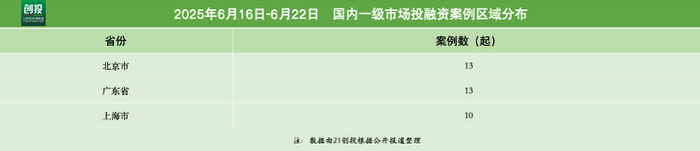 从披露获投企业的地域分布来看,本周的融资地区主要集中在北京市、广东省和上海市。北京市和广东省各完成13笔融资,上海市完成10笔融资。