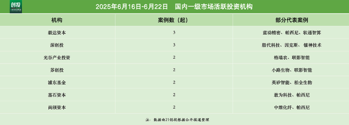 从机构投资活跃度来看,本周深毅达资本和创新投各完成3笔融资。光谷产业投资、苏创投、浦东基金、基石资本和尚欣资本完成2笔融资。