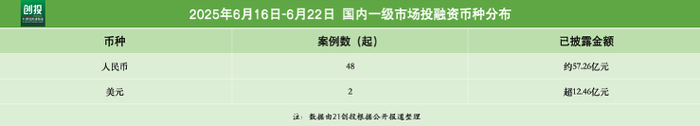 21创投不完全统计,6月16日—6月22日,报告日期内国内一级市场发生融资事件60起。其中,有50笔融资披露了融资金额和币种信息,总规模约人民币69.72亿元。