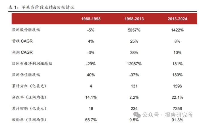 股价表现来看,进入成熟期后,股价涨幅依然可观,分红回购对股价支撑贡献加大。对于 苹果而言,2013 年之后增速下台阶,收入/利润复合增速分别为 8%/10%。可乐成长性差 些,2011-2024 年收入基本没有增长,利润复合增速 3%。低增速时期两家公司大额分红 回购,对股价形成有效支撑,只是形式上有所差异,苹果回购为主、可乐更多是分红。 我们对 1988-2024 年苹果业绩、估值、股东回报分为三个阶段复盘: 1988-1998 年:个人电脑市场的失败导致公司股价下跌,期间营收复合增速不到 4%,利 润出现下滑。 1998-2013 年:乔布斯回购后公司在 imac、ipod、iphone 等产品上接连取得成功,期间 营收、利润快速增长,估值消化。 2013-2024 年:此阶段公司业绩增速明显下台阶,但开始大额分红回购,对估值形成强力 支撑,股价仍然实现不错涨幅。