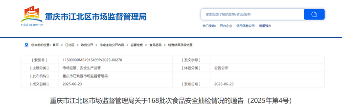 重庆市江北区市场监督管理局关于168批次食品安全抽检情况的通告(2025年第4号)