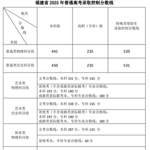 2025年福建普通高考录取控制分数线公布:本科线物理科441分、历史科450分。