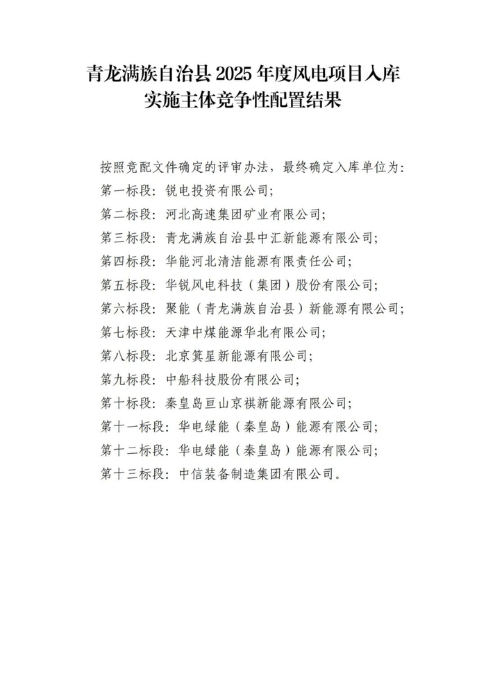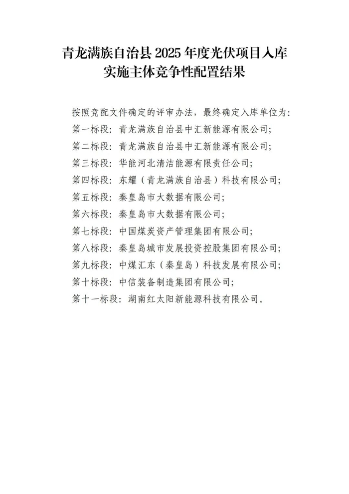 按照秦皇岛市政府办公室《关于落实2025年部分陆上风电光伏项目入库出库原则的通知》要求和秦皇岛市发展和改革委员会统一部署,经秦皇岛市发展和改革委员会、青龙满族自治县发展和改革局及第三方咨询单位对报名企业提供的基本要件进行评审,现对青龙满族自治县2025年度新能源项目入库实施主体竞争性配置结果予以公示。