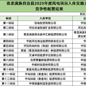 风电头条获悉,6月23日,青龙满族自治县2025年度新能源项目入库实施主体竞争性配置结果公示。