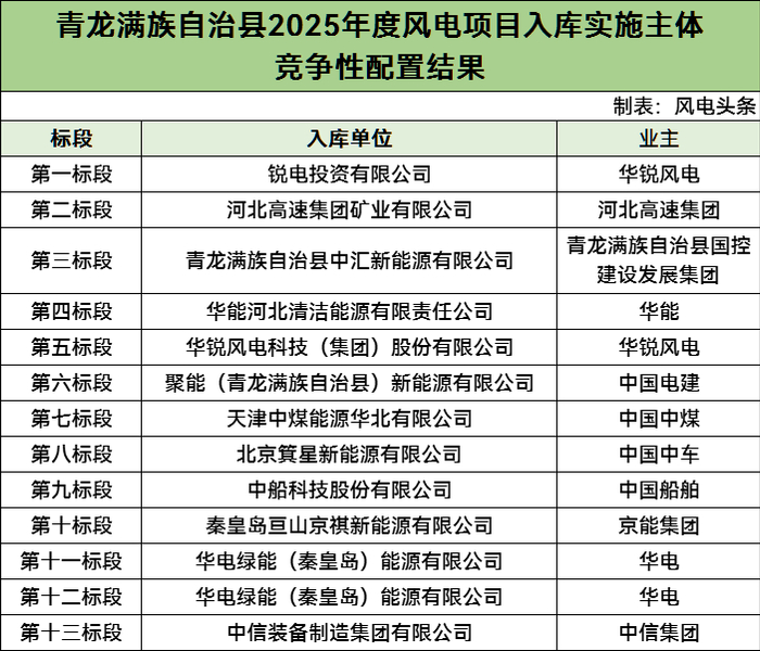 根据公示,青龙满族自治县新能源入库项目中风电项目共十三个标段,从竞配结果业主方面看,涉及华能、华电、中国电建、中国中煤、中国中车、中国船舶、京能集团、中信集团、华锐风电等。