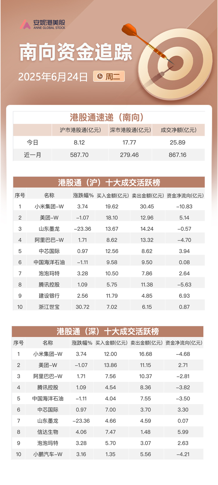 全天南向资金净流入约25.95亿港元,连续19个交易日保持净流入。其中沪港股通净流入约8.12亿港元,深港股通净流入约17.77亿港元。