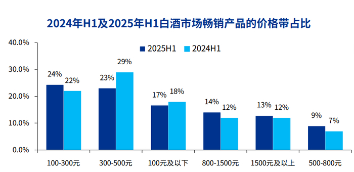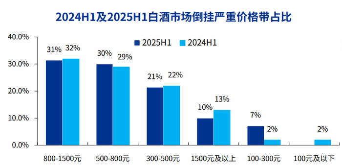 根据这份研究报告,2025年1~6月白酒市场经销商、零售商反馈市场动销最好的前三价格带分别为100元~300元、300元~500元、100元及以下;倒挂程度前三价格带分别为800元~1500元、500元~800元、300元~500元。