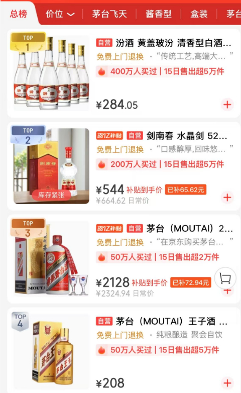 《每日经济新闻·将进酒》从京东公布的白酒热卖榜发现,在京东商城平台上,汾酒的黄盖玻汾一直处于热卖榜第一,其价格为284元,该产品累计购买人数已超过400万;而价格在200元出头的茅台王子酒,则排在白酒热卖榜第四。若不考虑上榜的飞天茅台、第八代五粮液和水晶剑等名酒,单从价格来看,100元~300元的确是最受青睐的价格带。
