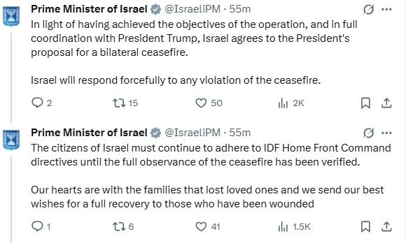 北京时间下午3点08分,以色列官方账号发文称:“鉴于已经实现了行动目标,并与特朗普总统充分协调,以色列同意总统关于双边停火的建议。”
