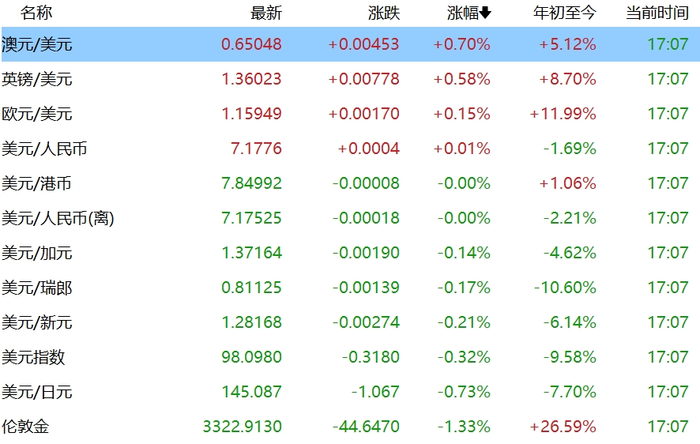 美元指数下跌0.32%,报98.098。欧元兑美元上涨0.15%,而日圆兑美元下跌0.73%,至145.087。