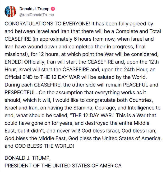他在帖子中写道:“祝贺大家!以色列与伊朗已完全达成协议,(将在大约6小时后,当以色列和伊朗完成正在进行的最后任务时!),实施为期12小时的全面停火,届时战争将被视为结束!正式而言,伊朗将率先启动停火,12小时后以色列将启动停火,24小时后,世界将共同庆祝这场为期12天的战争正式结束。”