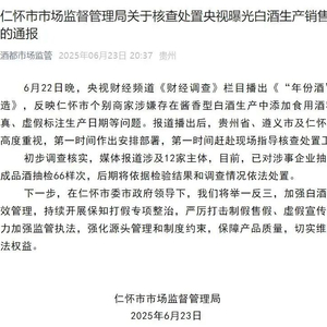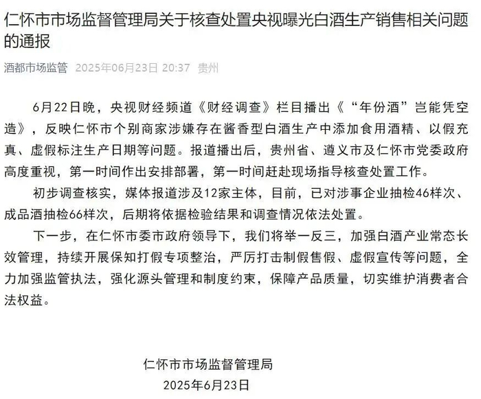 2025年6月央视《财经调查》曝光“年份酒造假”后,仁怀市政府快速响应立即对12家涉事企业抽检基酒46样次、成品酒66样次,后续将依据检验结果依法处置。同时,宣布持续开展保知打假专项整治,强化源头管理和制度约束。
