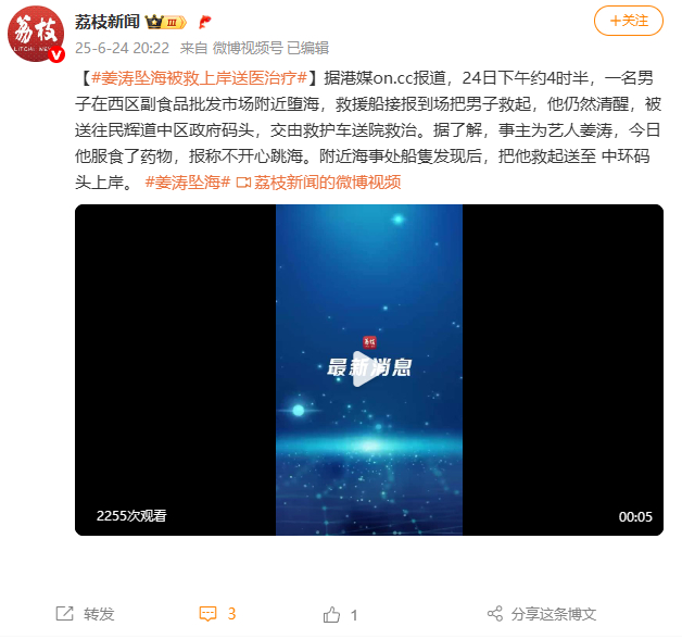 据香港媒体报道,事主为艺人姜涛,今日他服食了药物,报称不开心跳海。附近海事处船隻发现后,把他救起送至中环码头上岸。