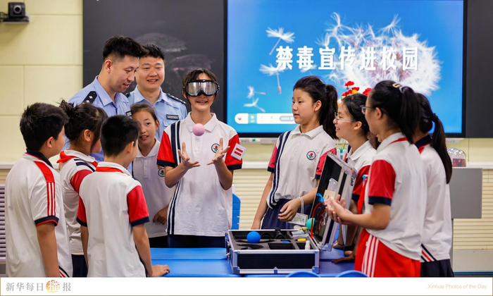 6月23日,在天津市滨海新区塘沽实验小学,民警利用模拟吸毒幻视体验让孩子感受吸毒危害。国际禁毒日将至,各地开展形式多样的禁毒戒毒宣传教育活动,增强人们防范毒品的意识和能力。