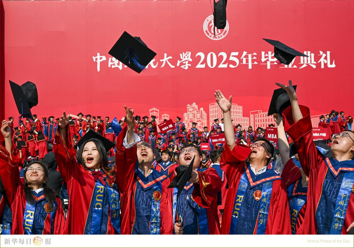 6月23日,毕业生在中国人民大学毕业典礼后抛帽庆祝。当日,中国人民大学举办2025年毕业日系列活动,包括毕业典礼、学位授予仪式、青春歌会等。据了解,今年中国人民大学共有8390名毕业生学成毕业,踏上崭新的人生旅程。