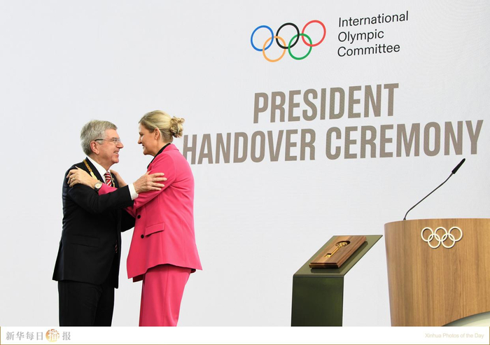 6月23日,托马斯·巴赫(左)和柯丝蒂·考文垂在主席职位交接仪式上。当日,国际奥委会在瑞士洛桑总部举行主席职位交接仪式,津巴布韦的柯丝蒂·考文垂接替托马斯·巴赫,正式就职国际奥委会第十任主席。考文垂是国际奥委会创立131年来首位女性主席,也是首位来自非洲的掌舵人。