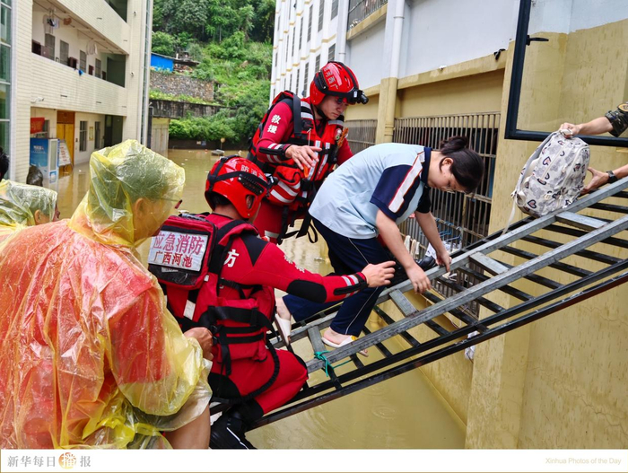 6月23日,救援人员在广西天峨县民族中学转移学生。当日,受持续强降雨影响,广西天峨县民族中学出现内涝,400多名初三学生及30名教师受困校内。据了解,该校为2025年中考考点,为确保考生安全及考试顺利进行,当地将受困学生紧急转移至备用考点天峨县高级中学。