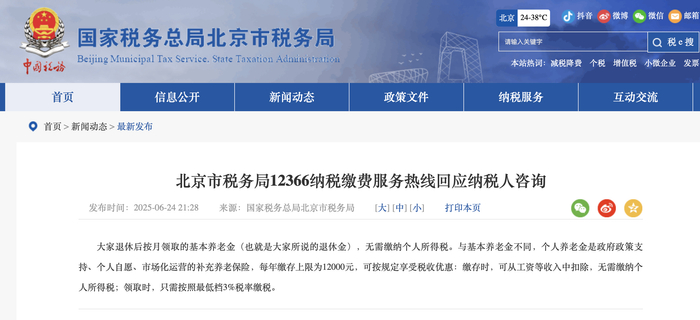 人民财讯6月24日电,北京市税务局12366纳税缴费服务热线回应纳税人咨询称,大家退休后按月领取的基本养老金(也就是大家所说的退休金),无需缴纳个人所得税。与基本养老金不同,个人养老金是政府政策支持、个人自愿、市场化运营的补充养老保险,每年缴存上限为12000元,可按规定享受税收优惠:缴存时,可从工资等收入中扣除,无需缴纳个人所得税;领取时,只需按照最低档3%税率缴税。