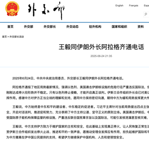 据外交部官方网站消息,2025年6月24日,中共中央政治局委员、外交部长王毅同伊朗外长阿拉格齐通电话。
