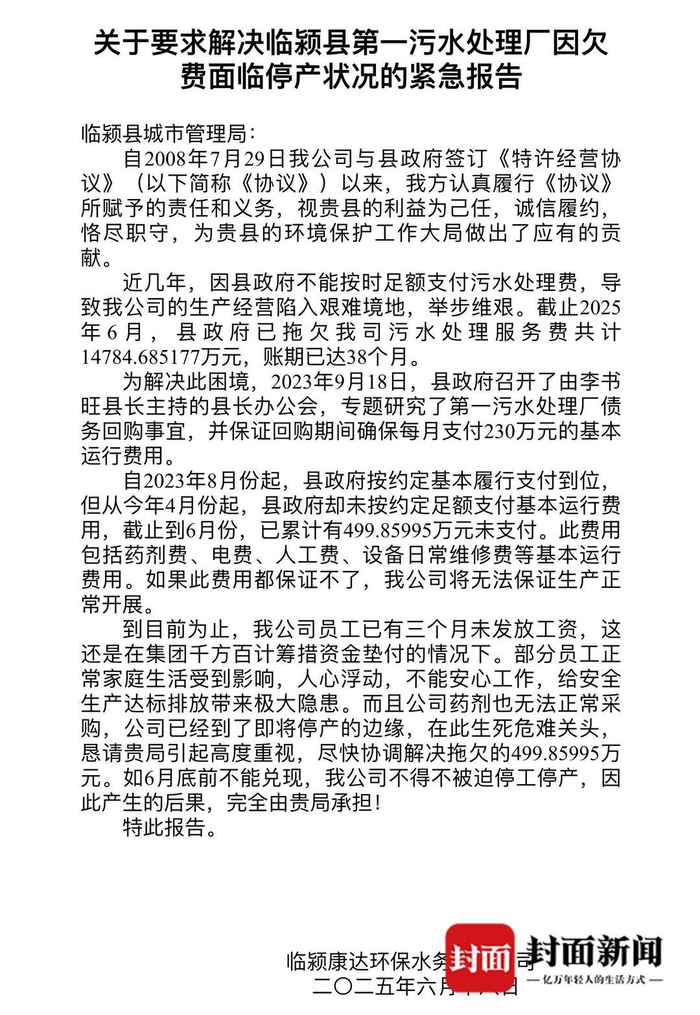 6月18日,临颍康达又向临颍县城管局递交了一份紧急报告。报告称,由于政府欠费,员工已有3个月未发放工资,药剂也无法正常采购,公司已经到了即将停产的边缘,“恳请城管局尽快协调解决当初承诺的,每月230万元的基本运营费,合计500万元。”