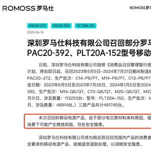 事发后,罗马仕虽然立即“按照相关要求”召回2023年6月5日-2024年7月31日期间制造的部分罗马仕ROMOSS牌充电宝,并且已在淘宝、京东、抖音等多平台大面积下架,涉及型号包括PAC20-272、PAC20-392、PLT20A-152,涉及数量达到491745台,召回原因为“部分电芯原材料来料原因,极少数产品在使用过程中可能存在过热现象,在极端场景下可能产生燃烧风险,存在安全隐患”。