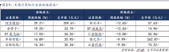 本周计算机行业涨幅前五的公司分别为四方精创(+29.21%)、金橙子(+19.25%)、ST英飞拓(+17.05%)、华铭智能(+16.89%)、安联锐视(+16.34%);跌幅前五的公司分别为新北洋(-12.65%)、ST迪威迅(-12.63%)、汇金股份(-10.08%)、银之杰(-9.99%)、云鼎科技(-9.55%)。