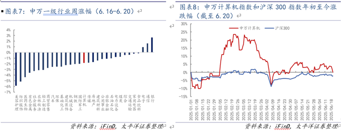 行情回顾: 本周(2025.6.16-2025.6.22)申万计算机行业指数下跌1.83%,在31个申万一级行业中排名第16位。截至本周五(6月20日),计算机行业指数与年初持平,跑赢沪深300指数2.24pct。