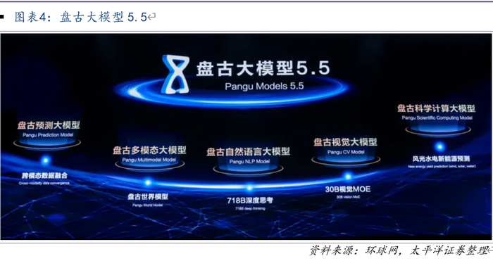 盘古自然语言处理NLP大模型:盘古5.5在NLP领域主要有三大模型组成,即盘古 Ultra MoE、盘古 Pro MoE、盘古 Embedding;以及快慢思考合一的高效推理策略、盘古深度研究产品 DeepDiver。其中,1)盘古 Ultra MoE:是一个7180亿参数的深度思考模型,由256个专家组成的MoE大模型,在知识推理、工具调用、数学等领域大幅增强,实现能力领先。2)盘古 Pro MoE :是一个 72B A16B 的模型,即每次工作时会激活其中 160 亿参数。在刚刚发布的五月底 SuperCLUE 榜单上,盘古 Pro MoE 在千亿参数量以内的模型中,排行并列国内第一。3)盘古 Embedding:参数量7B级,在学科知识、编码、数学和对话能力方面均优于同期同规模模型。4)盘古 DeepDiver:在网页搜索、常识性问答等应用上具备较高的执行效率,如可以在5分钟内完成超过10跳的复杂问答、生成万字以上的专业调研报告等,大幅提升工作效率。