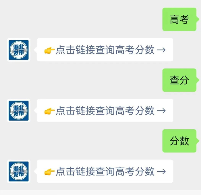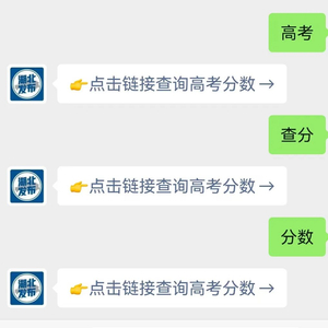在对话页面输入以下关键词之一:【高考】【查分】【分数】