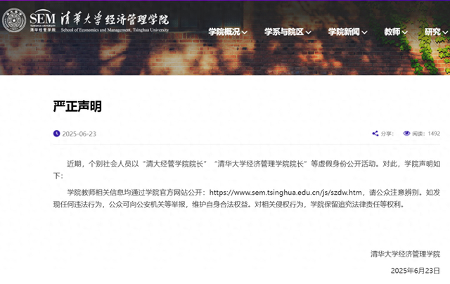 6月23日,清华大学经济管理学院发布声明称,个别社会人员以“清大经管学院院长”“清华大学经济管理学院院长”等虚假身份公开活动。