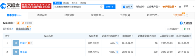 天眼查显示,“清大经管”品牌所有人为北京清大纵横教育科技有限公司(以下简称“清大纵横”),清大纵横注册于2013年9月9日,现股东为自然人王玉,曹玉磊曾持股后于2020年6月退出。