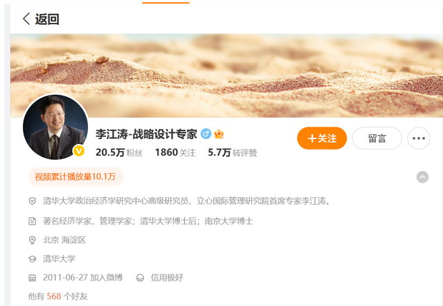 李江涛在微博的介绍显示,其为清华大学政治经济学研究中心高级研究员,是清华大学博士后、南京大学博士。